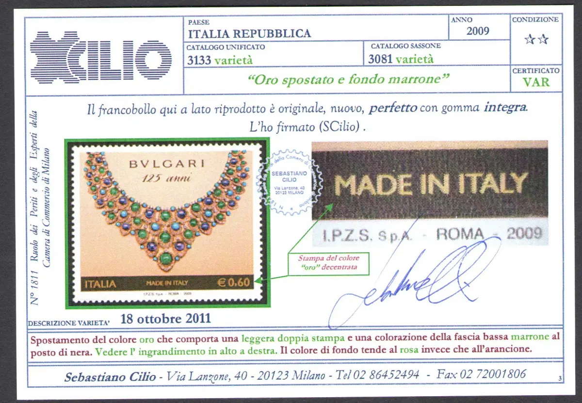 2009 Italien - Republik - Nr. 3081 Bulgari 0,60 MNH ** VARIETÉ Zertifikat CILIO