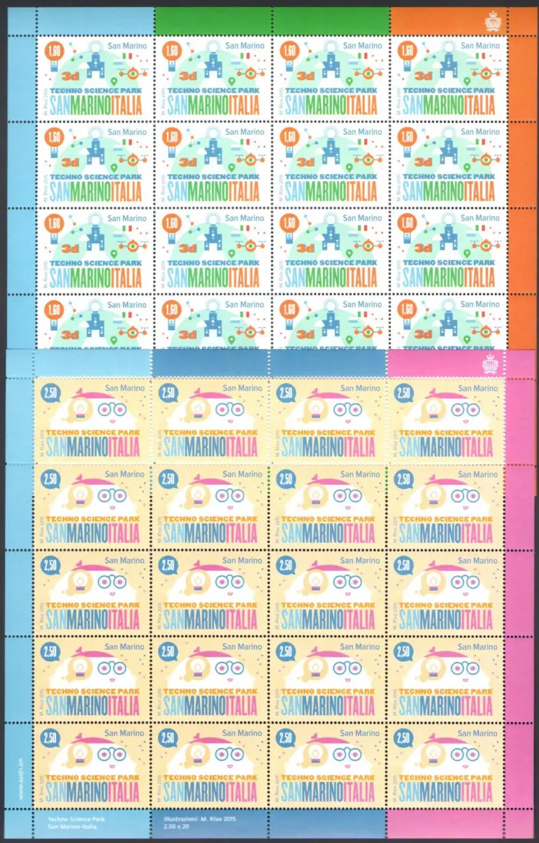 2015 San Marino Parco Scientifico 2 Werte, gemeinsame Ausgabe mit Italien, neuer und perfekter Vollgummi Nr. 2495/96 Einheitlicher Katalog MNH ** - Vollständige und perfekte Kleinblätter mit jeweils 20 Serien.