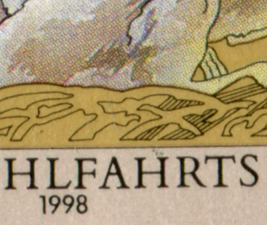 bestätigter Plattenfehler auf Feld 7: schwarzer Fleck über zweitem H von WOHLFAHRTSPFLEGE
