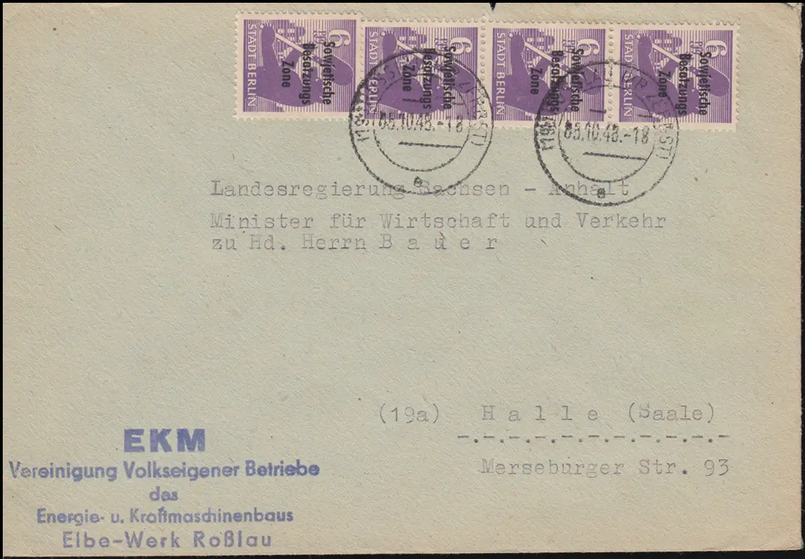 201A SBZ-Aufdrucke als MeF auf Fernsbrief ROSSLAU (Bz.LEIPZIG) 5.10.1948
