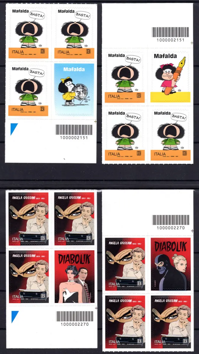 2022 Emission Mafalda und Ausgabe Angela Giussani die vier oberen und unteren Viertel rechts mit Barcode und die beiden verschiedenen Erinnophilen von Mafalda und Diabolik - Cod. 1667/WEB