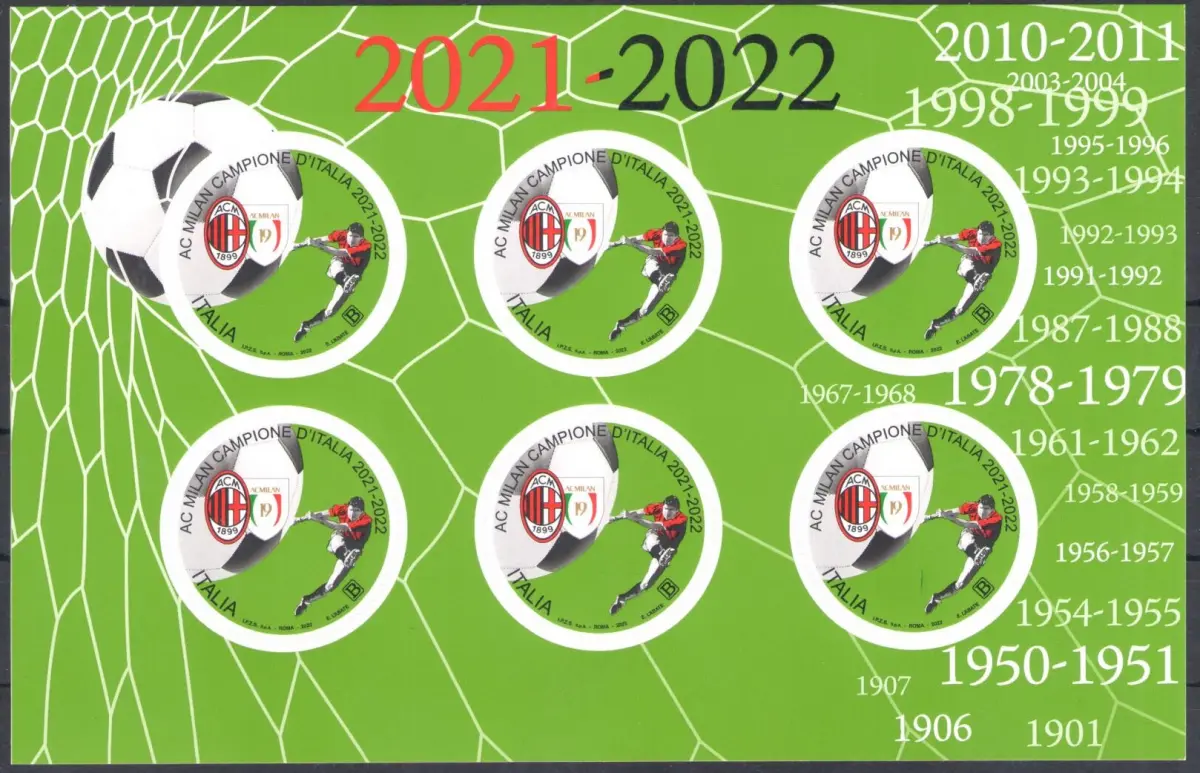 2022 Italien - Republik, AC Mailand Italienischer Meister 2021-2022, Miniblatt mit 6 Werten - Fußball - MNH ** Einheitlicher Eurokatalog Neue Briefmarken - Fußballzettel - Fußballmannschaften - Philatelie - Sammeln - Seltene Briefmarken - Mailand - Italienischer Meister - 2021-2022 Italienische Fußballmeisterschaft