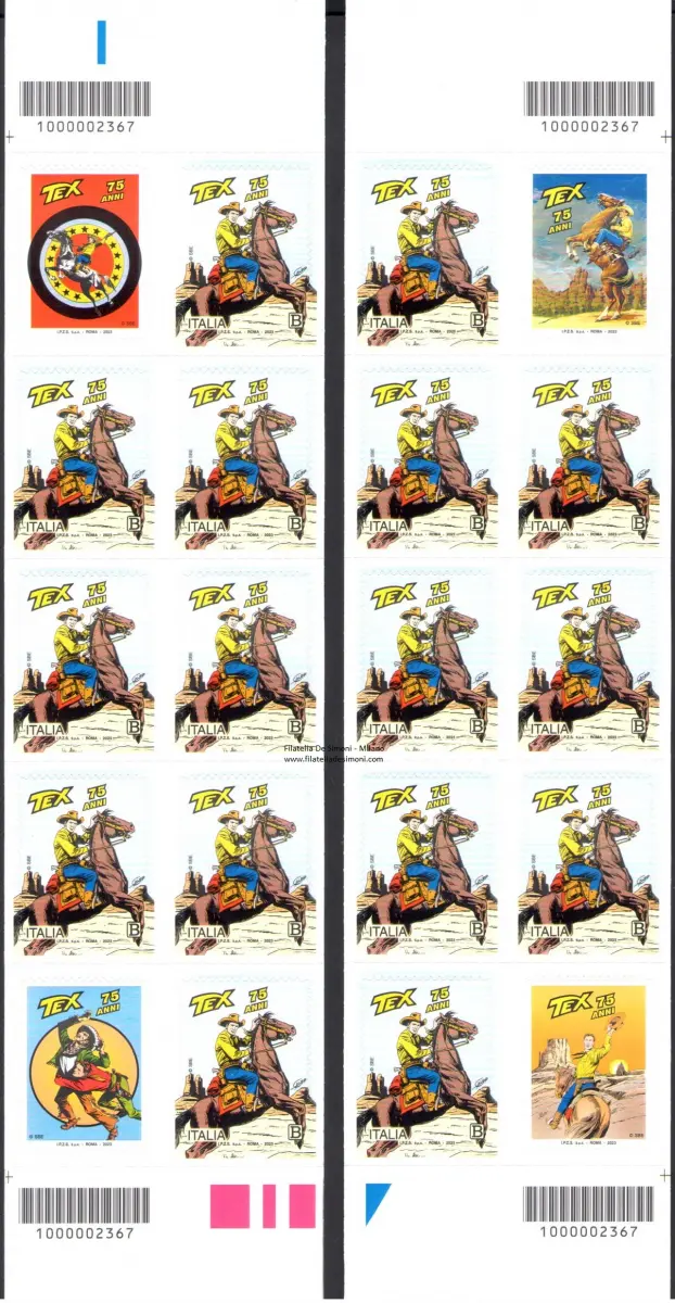 2023 Italien, Tex Willer, 2 vertikale Streifen + 4 Briefverschlüsse und Barcode