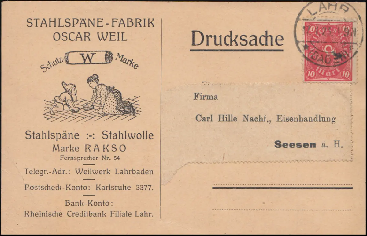 206 Posthorn als EF Drucksache Stahlspäne-Fabrik Weil in LAHR 1923 nach Seesen