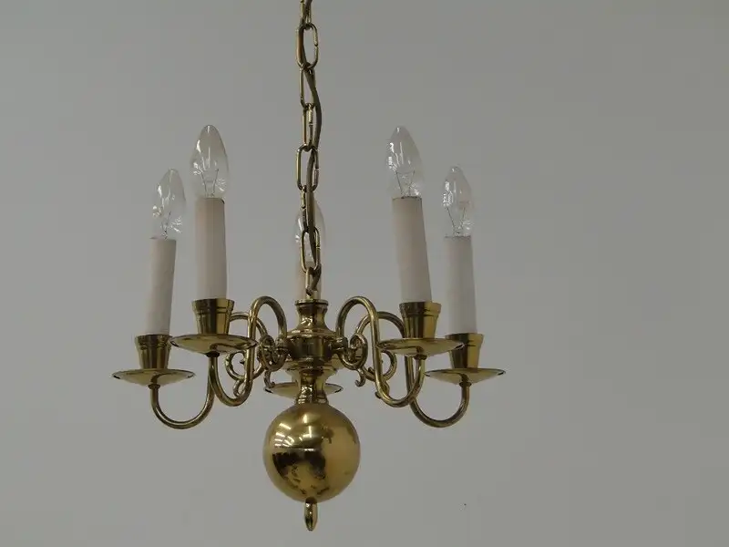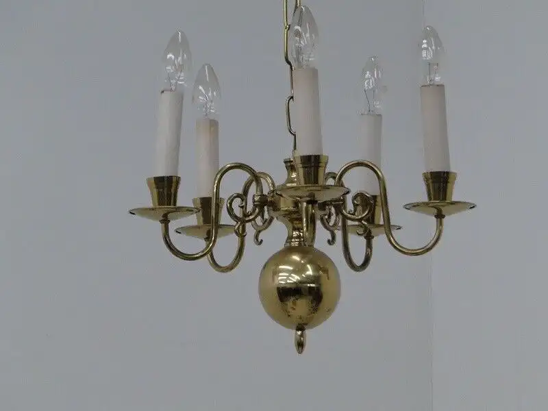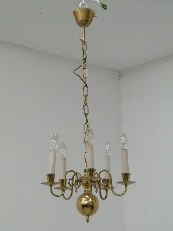 Ein schlichter Messingluster, 5flammig, höhenverstellbar, gehört noch gereinigt, funktionstüchtig - jedoch keine Gewähr auf die Elektronik, da wir nicht sagen können ob diese der geltenden Norm entspricht, exkl. Leuchtmittel. \n\nMaße: Durchmesser: ca. 40 cm breit ca. 80 cm hoch \n\nArtikelnummer: 2065D H