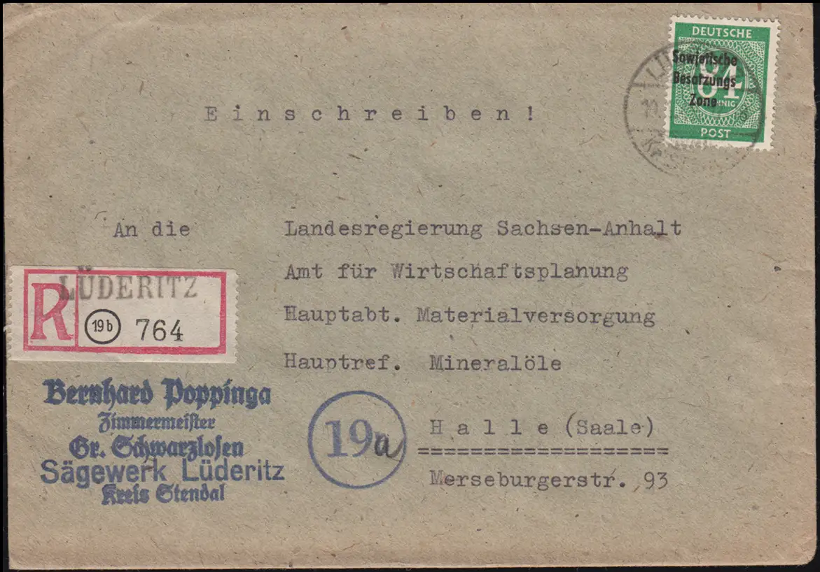 211 SBZ-Aufdruck als EF auf R-Brief Not-R-Zettel LÜDERITZ (Kr. STENDAL) 11.1.49