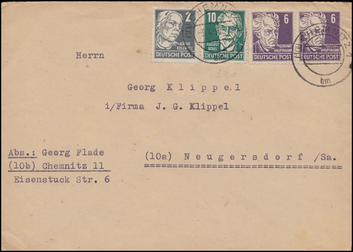 212 Kollwitz + 213 Hauptmann + Bebel als MiF auf Brief CHEMNITZ 3.4.1950