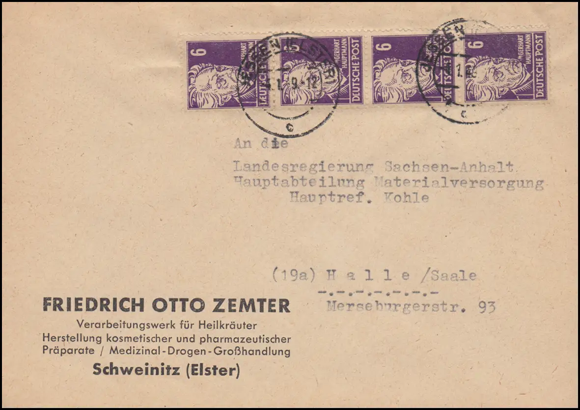 von der Firma Zemter / Verabeitungswerk für Heilkräuter an die Landesregierung Sachsen-Anhalt / Hauptreferat Kohle in Halle / Saale
