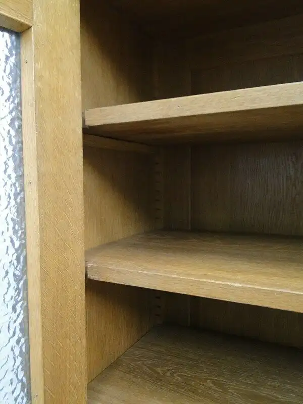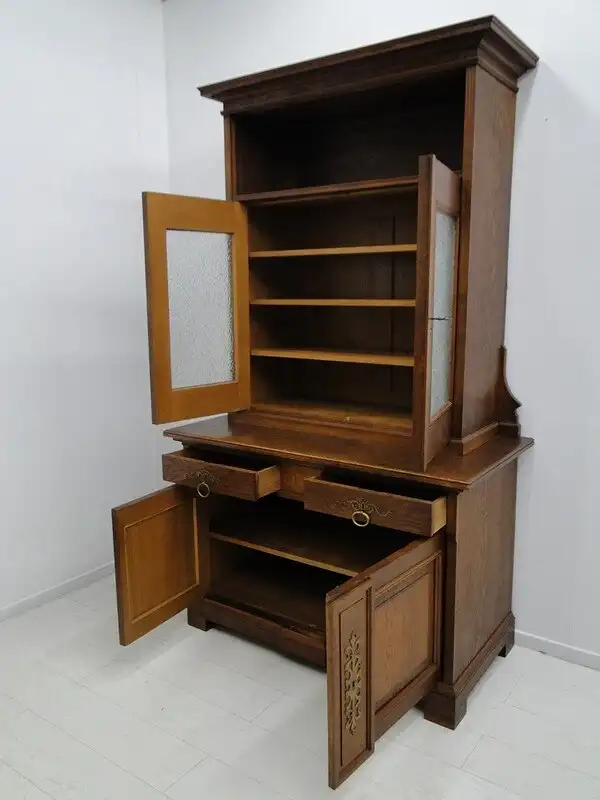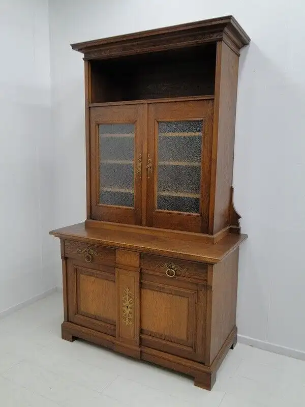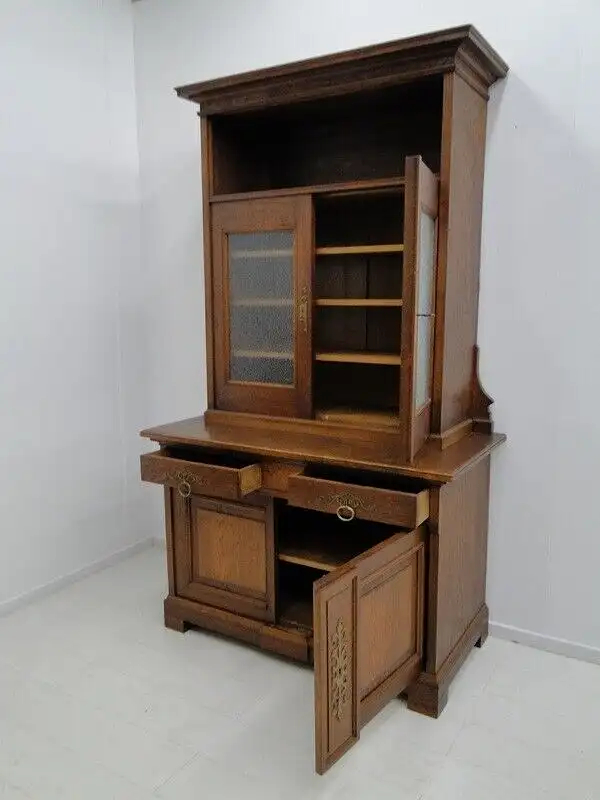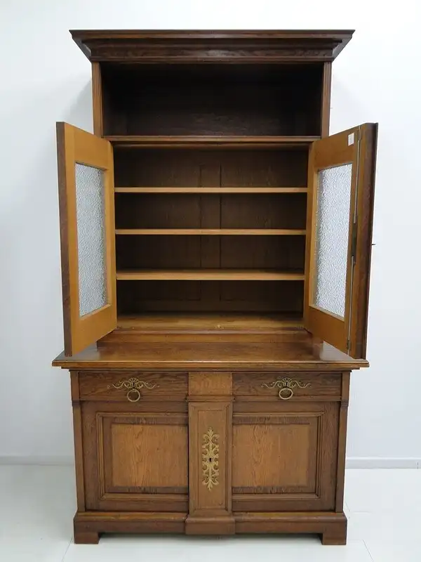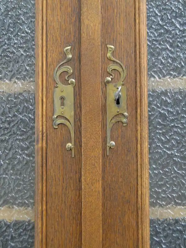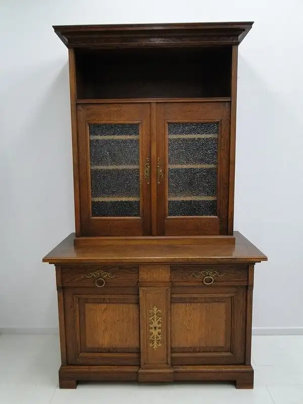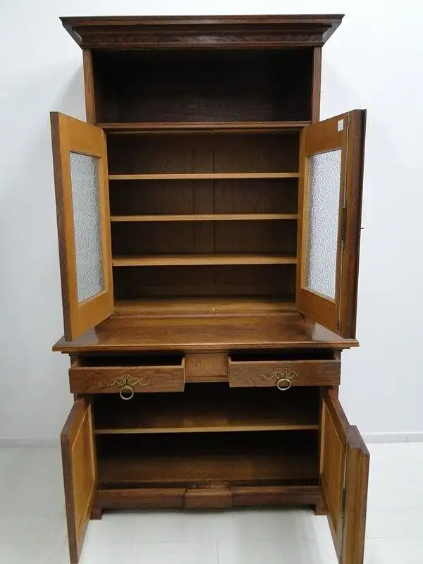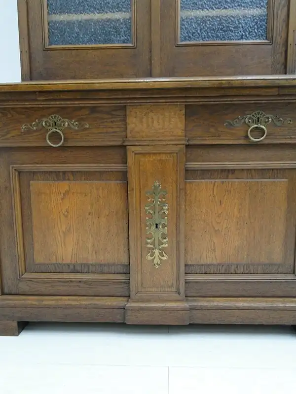 Eine gut erhaltene Jugendstilkredenz, Eiche-Korpus, schöne Holzmaserung, schlichtes, geradliniges Design, 2 Schubladen und 4 Flügeltüren vorhanden, 2 davon mit Glaseinsätzen, schöne Beschläge, ORIGINAL Schlösser mit einem Schlüssel, im unteren Bereich ist ein durchgehendes Fach vorhanden, oben befinden sich 3 Fächer - diese sind individuell höhenverstellbar mittels Verzahnung, der Beschlag zwischen den beiden Laden ist wohl im Laufe der Zeit abhanden gekommen, stört das Gesamtbild überhaupt nicht, muss nichts desto trotz erwähnt werden. \n\nMaße: ca. 126 cm breit ca. 216 cm hoch ca. 65 cm tief \n\nArtikelnummer: 2138 H