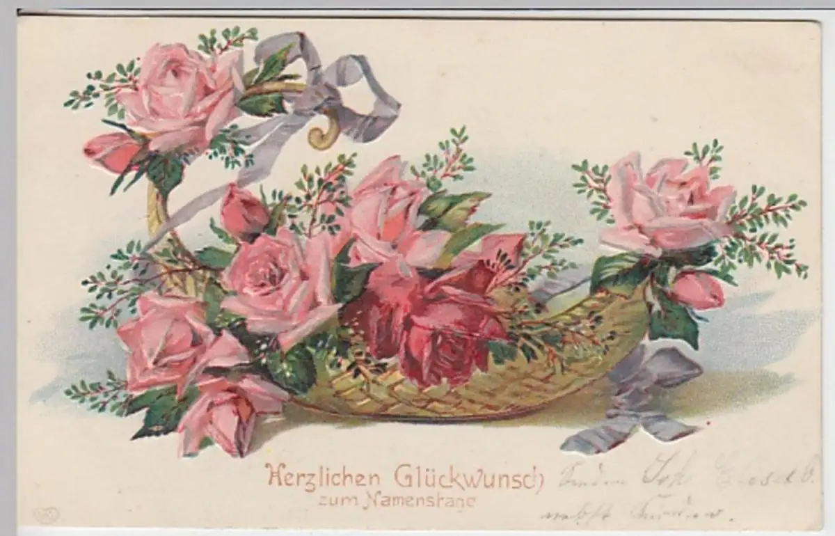 (22345) AK Namenstag, Rosenkorb, Prägekarte 1910