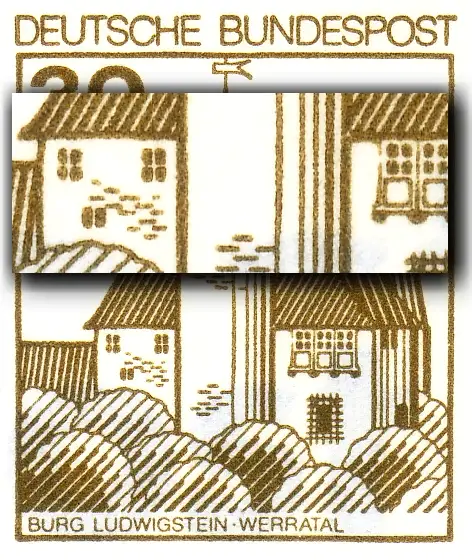 3 Adressen Postfach 2000 Berlin, Unterkante des Querstrichs im T von Post mit \"bei Kasse sind\" auf einer Linie; Vorstufe zum PLF IX: leicht gebogene Dachkante und Bruch im Fenster, Feld 2