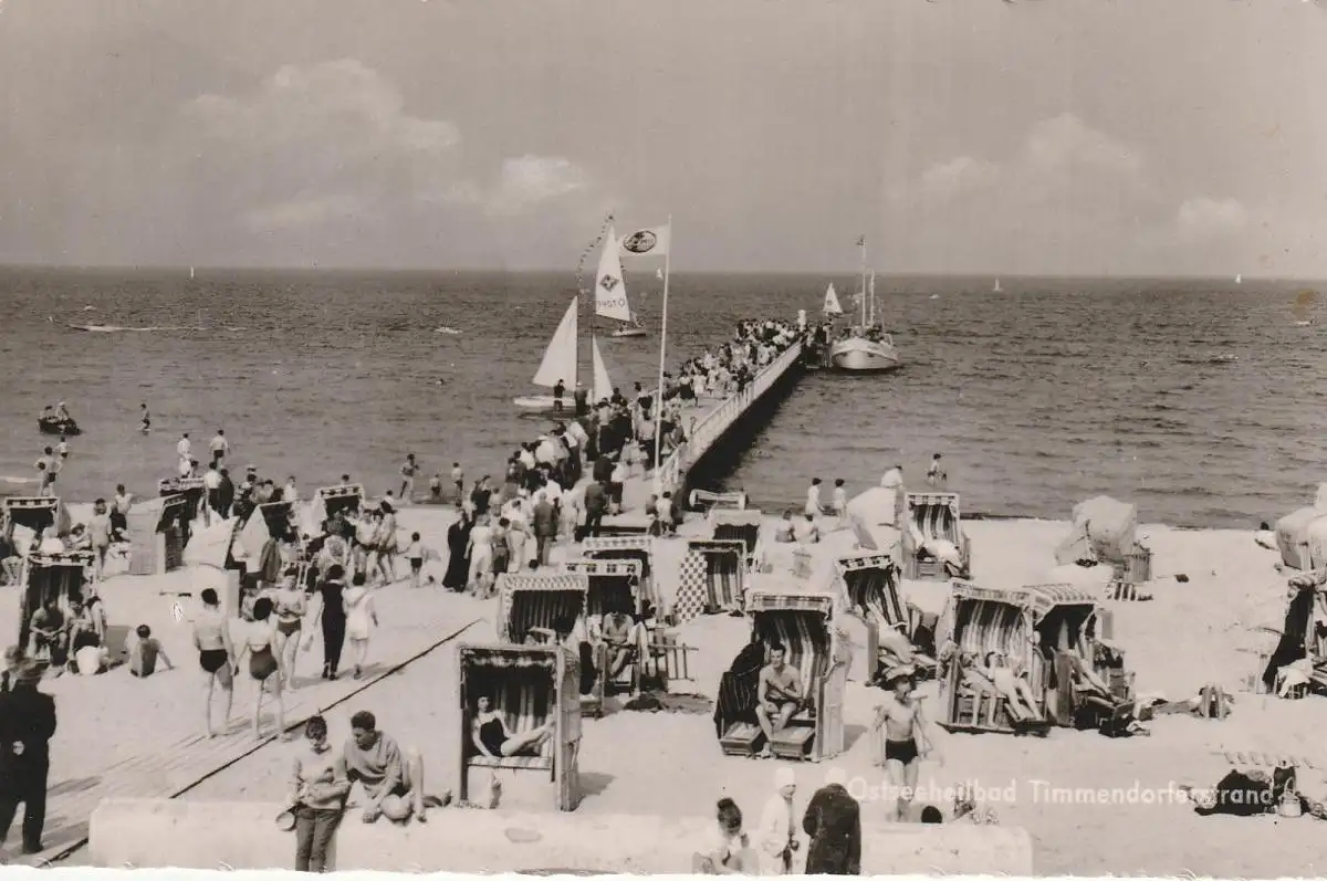 2408 TIMMENDORFER STRAND, Seesteg, Strandkörbe, DLRG - Fahne, 50er Jahre