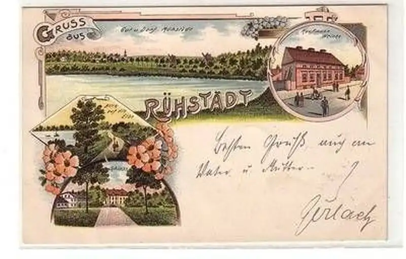 schöne farbige Lithographie, Gut und Dorf Rühstädt, Kaufmann Heinke, Blick auf die Elbe, Schloss, gelaufen, gute Erhaltung siehe Bild,