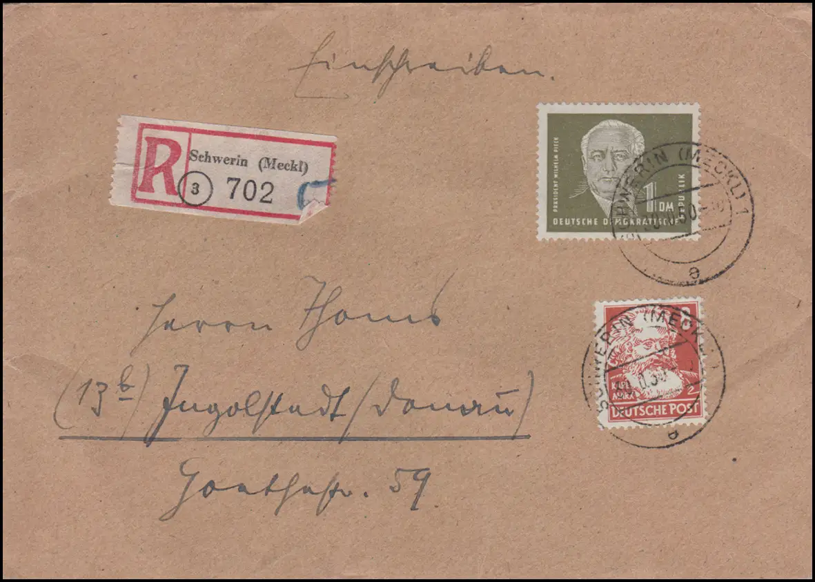 253 Pieck 1 DM mit 214 Marx 8 Pf als MiF auf R-Brief SCHWERIN 30.10.1950