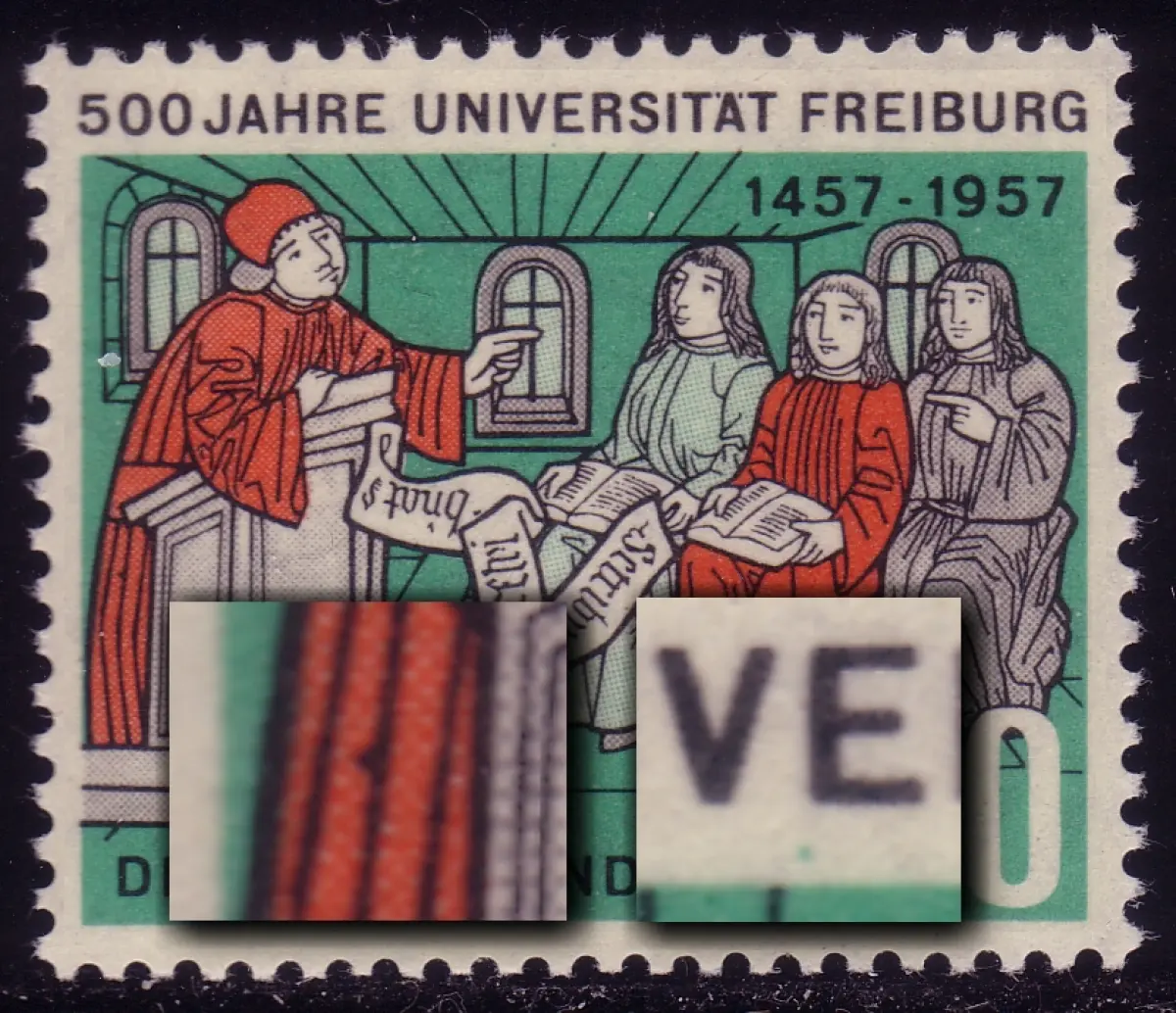 Doppel-Plattenfehler: grüner Fleck unter VE von UNIVERSITÄT und schwarzer Fleck an der Kutte des Dozenten