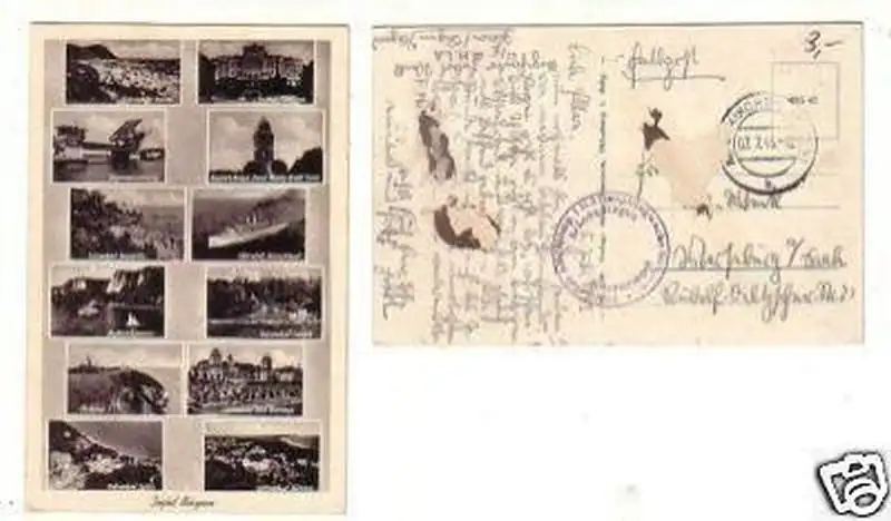 Ostseebad Baabe, Putbus Schloss, Rügendammbrücke, Rugard b. Bergen Ernst-Moritz-Arndt-Turm, Ostseebad Sassnitz, Fährschiff Deutschland, Stubbenkammer, Ostseebad Lohme, Arkona, Ostseebad Binz Kurhaus, Ostseebad Sellin, Ostseebad Göhren gelaufen als Feldpost, Briefstempel Flugmelde Res. Komp. 1M3 Hauptflugwache Strals. A. Arkona Rügen gute Erhaltung (rückseitig Kleberückstände), siehe Bild