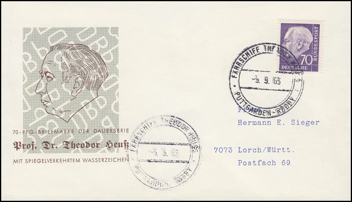 263xwZ Heuss 70 Pf. Abart spiegelverkehrtes Wasserzeichen MIT ZÄHLNR. auf Brief