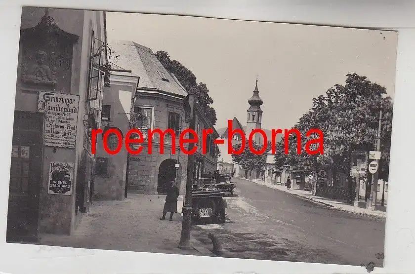 vorn links Hengl Stüberl Wiener Stadtbräu, an der Fassade eine Werbeschild Grinzinger Familienbad, dahinter Konditorei J. Zeschner ungelaufen sehr gute Erhaltung, siehe Bild