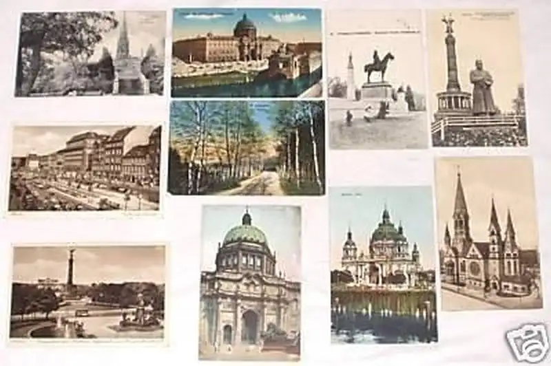 dabei Königsplatz mit Krolloper, Siegessäule und Bismarckdenkmal, Unter den Linden, Viktoriapark mit Denkmal, Birkenpartie bei Grünau, königliches Schloß mit Schloßfreiheit, Charlottenburg Denkmal Kaiser Friedrichs III, Königsplatz während der Hindenburg Nagelung, Kaiser Wilhelm Gedächtniskirche, Dom, königliches Schloß, gelaufen (3 Karten als Feldpost gelaufen), gute Erhaltung siehe Bild,
