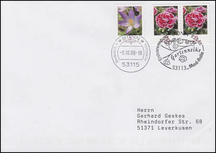 2699 Gartennelke, selbstklebend, mit 2480 Krokus,FDC Erstverwendung Bonn 9.10.08