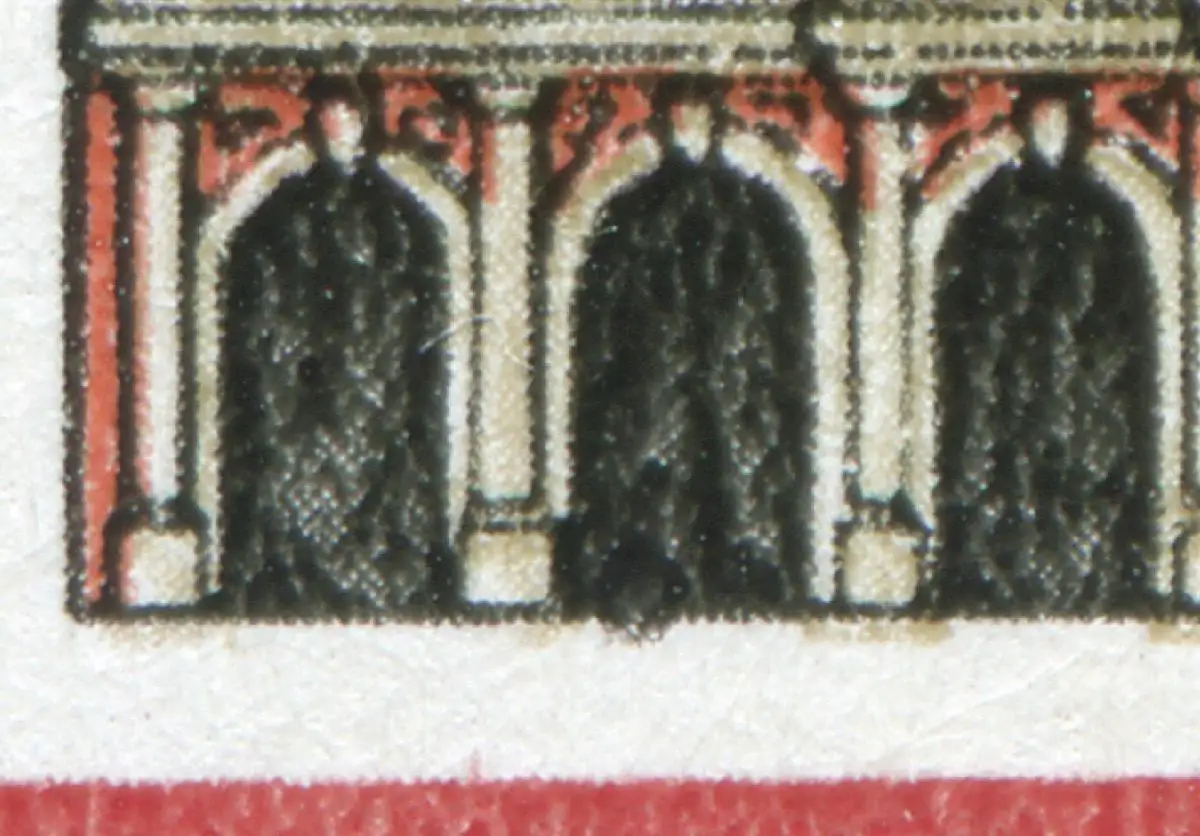 Plattenfehler: große Ausbuchtung unten am zweiten Torbogen von links [ähnlich wie Plattenfehler auf Feld 43], postfrisch