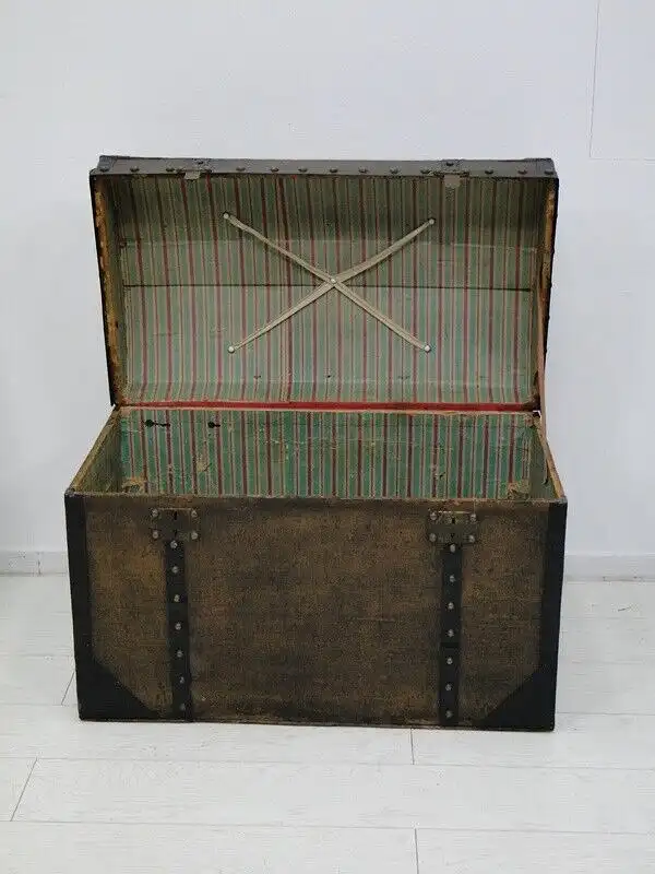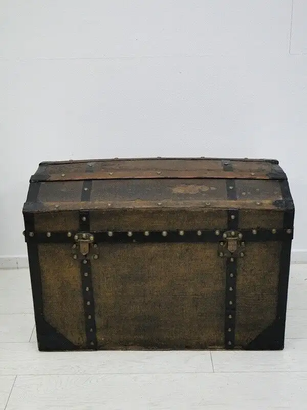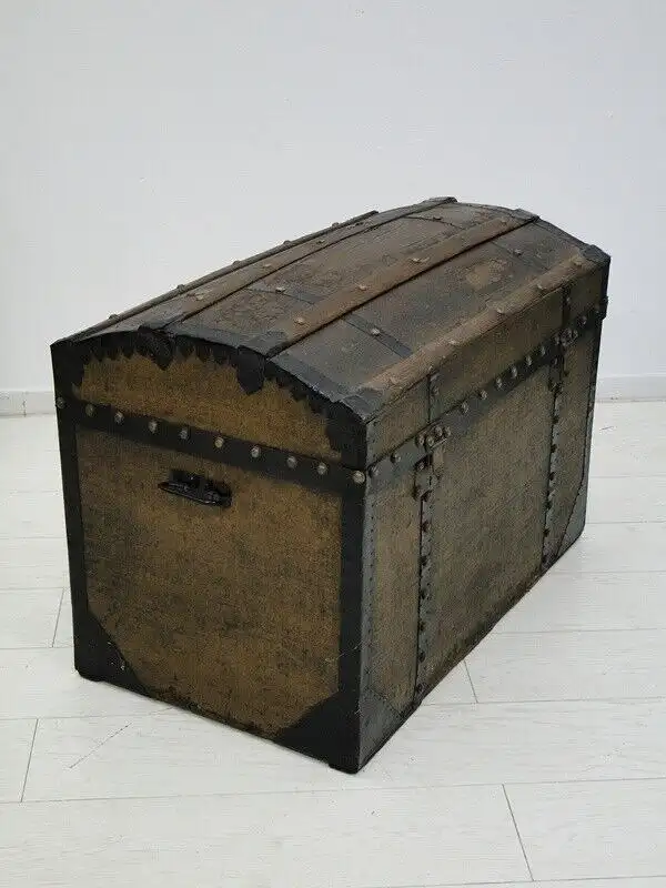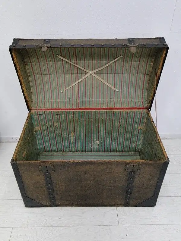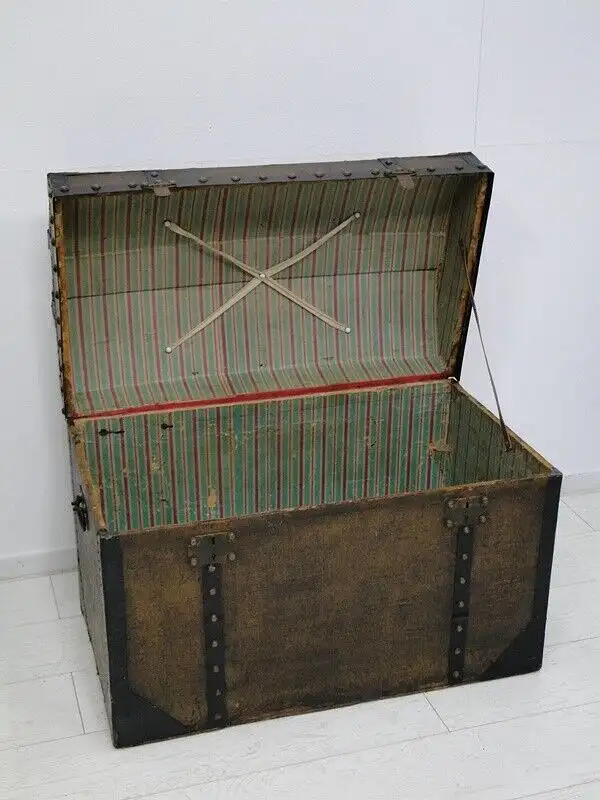 Eine sehr schöne Truhe um 1870,Holzkiste mit Metallverstrebung,2 Griffe,innen noch alte Tapezierung,seitlich ein Lederriemen,zum aufklappen, die Bilder sind Teil der Beschreibung, sehr guter Erhaltungszustand. \n\nMaße: ca. 87 cm breit ca. 60 cm hoch ca. 50 cm tief \n\nArtikelnummer: 2920