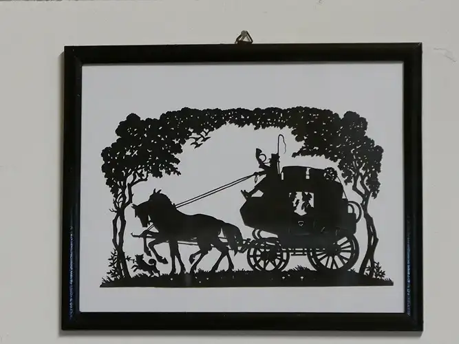 ein wunderschöner Scherenschnitt, hinter Glas, fachmännisch gerahmt, mit schönem, schwarzen Bilderrahmen. \n\nMaße: ca. 35 cm breit ca. 28 cm hoch \n\nArtikelnummer: 2989