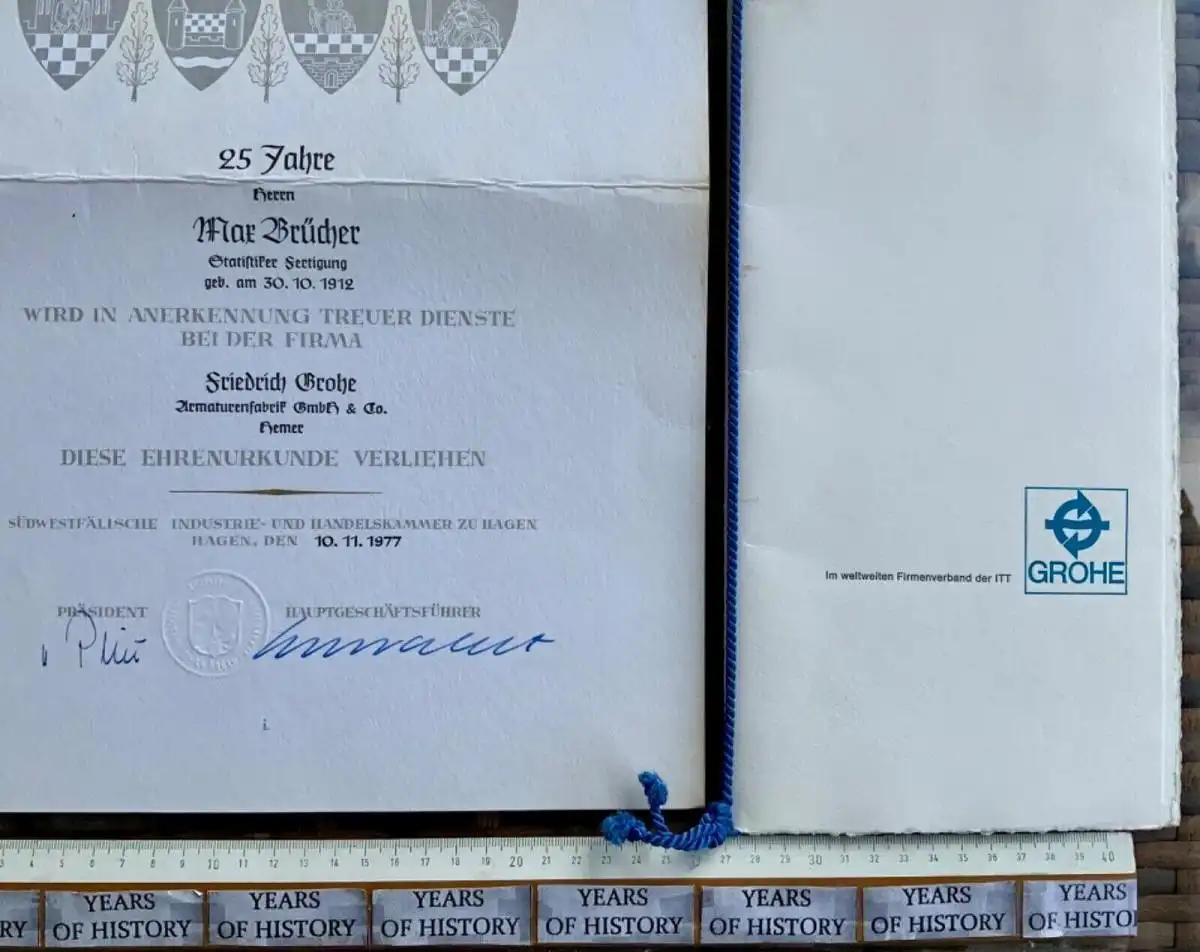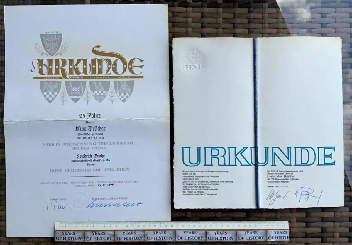 2x Ehrenkunde 25 Jahre Treue - Friedrich Grohe AG Armaturenfabrik Hemer Iserlohn