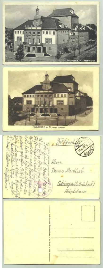 2x Heilbronn 1942 (intern : 1020601) Artikelbeschreibung u. Zustand : Siehe Scan. Weitere Infos : 2 alte Ansichtskarten mit Motiven aus Heilbronn. PLZ-Bereich pauschal 74072. Eine Karte postalisch gelaufen 1942