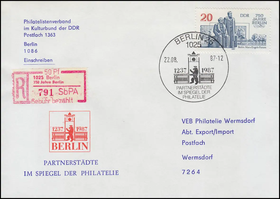 Einschreibe-Gebührenzettel für SbPÄ: Sonder-Einschreibemarke zum Jahrestag 750 Jahre Berlin 1987, Einschreibebrief VEB Philatelie Wermsdorf mit passender Frankatur, Sonderstempel "BERLIN 25 / 1237-1987 / Partnerstädte im Spiegel der Philatelie 22.8.87" mit Einlieferungsschein.
