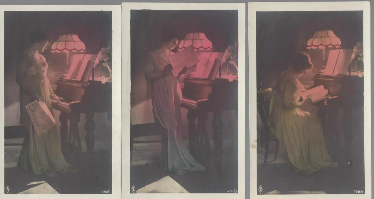 3 Karten Serie NBC Nr. 4741/3,5,6. Frau am Flügel.