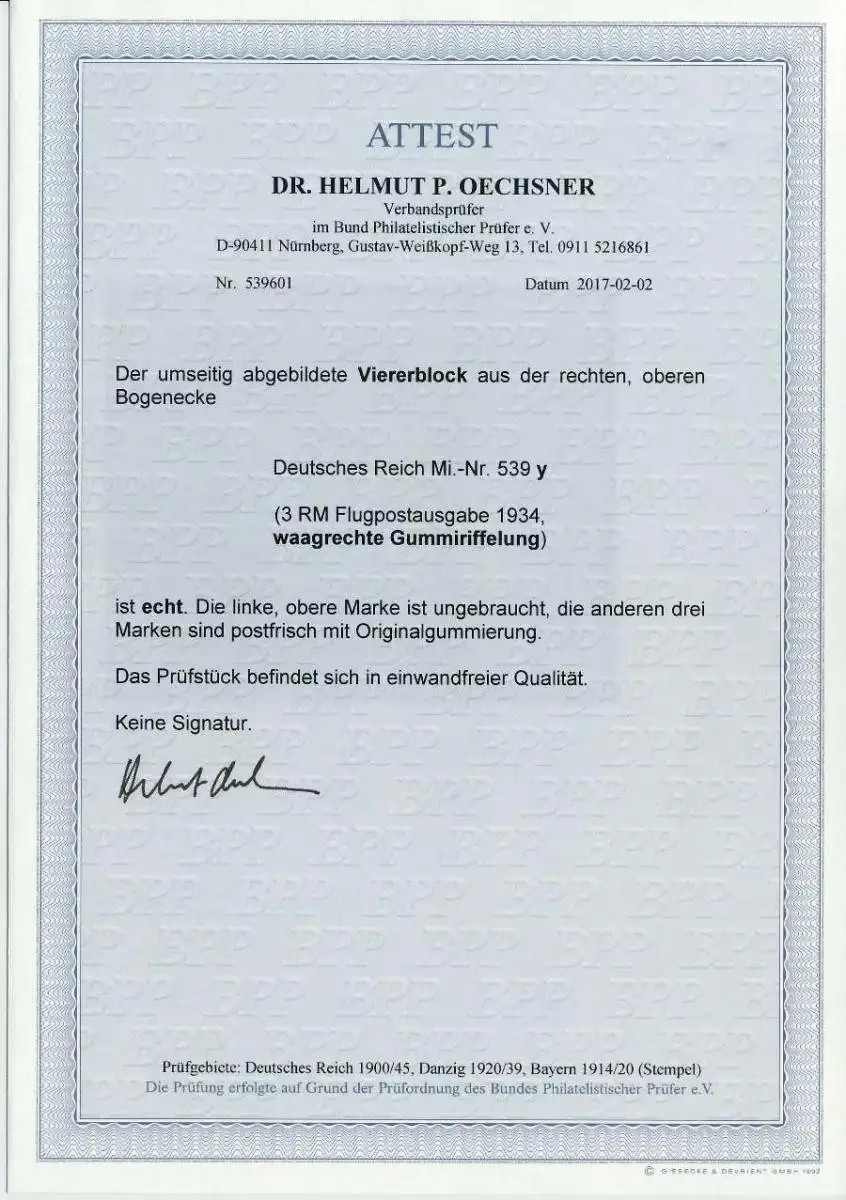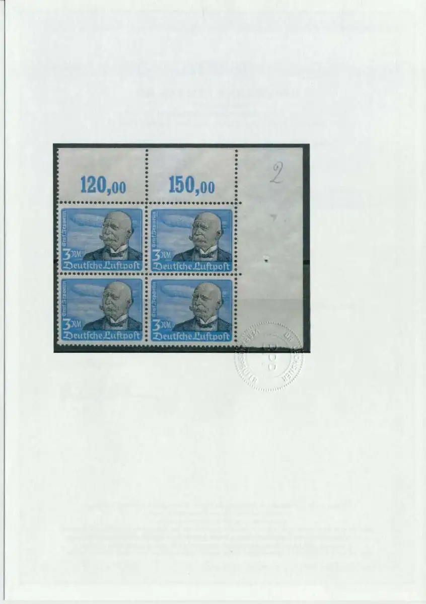 3 RM Wert aus der Flugpostausgabe von 1934, der im Attest beschrieben 4er Block wurde aufgeteilt. Geliefert wird die linke untere Marke mit einer Kopie des Attests des 4er Blocks. Durch den überbreiten Zahn in der unteren Reihe, wirkt die Ecke etwas rund.