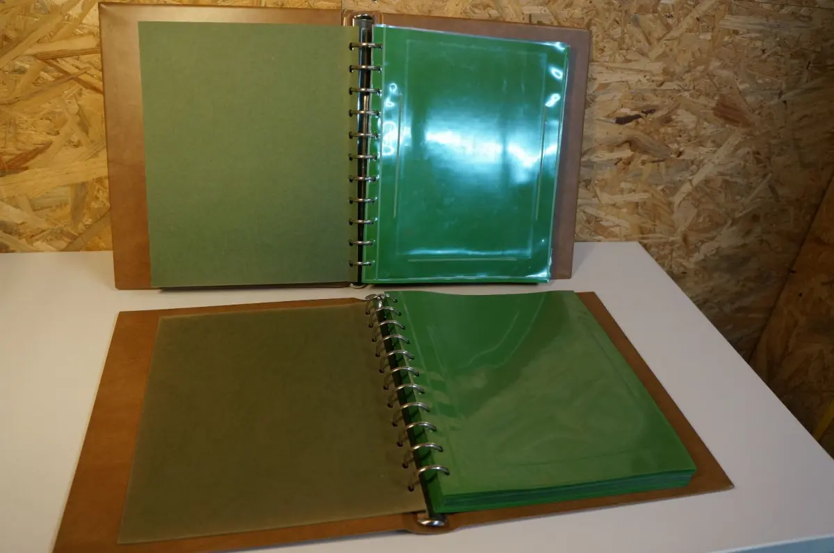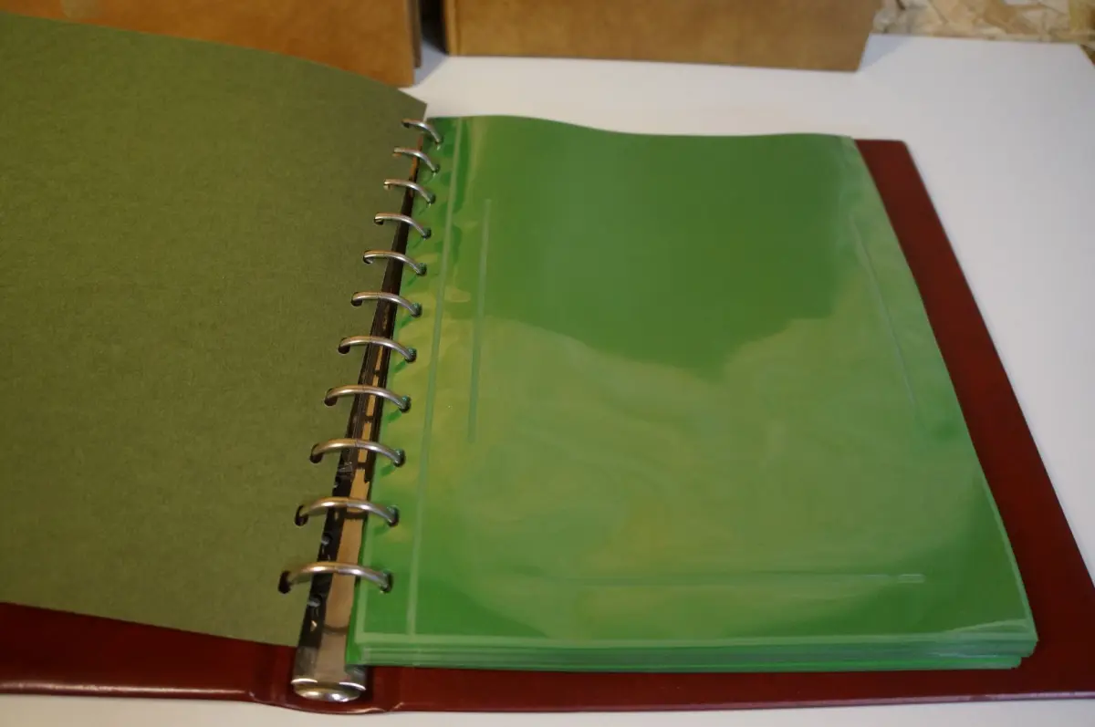 leere gut erhaltene Alben mit Gebrauchsspuren, am Rücken mit Kleberesten/Fleck, jedes Album mit 30-40 Hüllen für ETB + grüne Zwischenblätter, Hüllen können leicht gelblich sein, 2 Binder ohne Blattheber