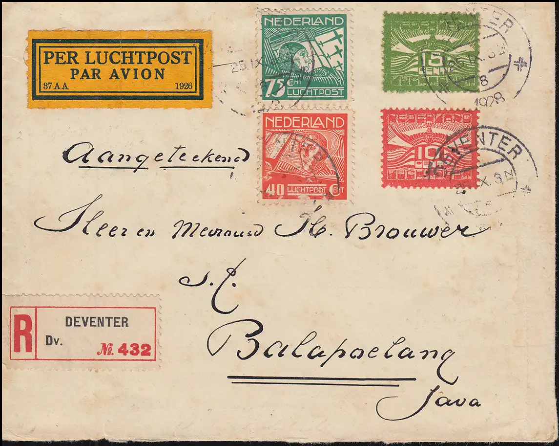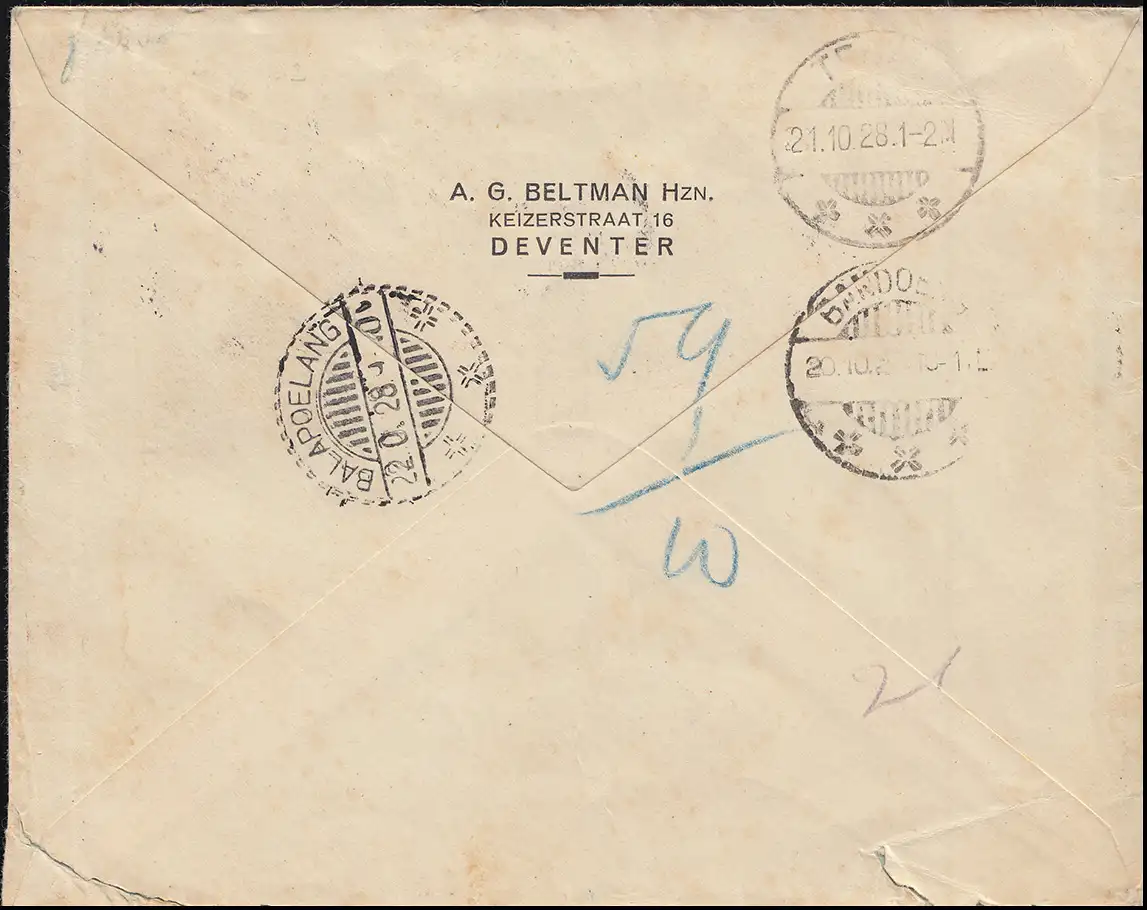 Nach dem Absturz / Notlandung in Cawnpore wurde das Einschreiben per Zug nach Kalkutta, Singapur, Tandjong Priok nach BANDOENG 20.10.28 befördert. Im Inland via Tegal nach BALAPOELANG Ankunftsstempel 22.10.2028.