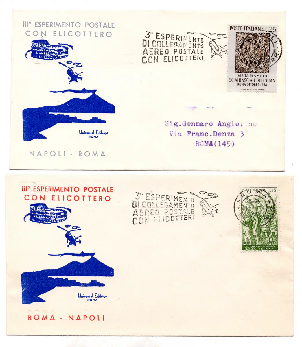 3. Versuch Luftpostverbindung mit Hubschraubern Rom/Neapel/Rom - 3. Versuch Luftpostverbindung mit Hubschraubern Rom/Neapel/Rom vom 13.2.59 - Die beiden Aerogramme mit Ann. Flugspezial (Kat. Pellegrini Nr. 00665/66) - Schönes Set - Bewertung 100/160 Nr. 610/20