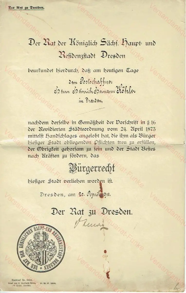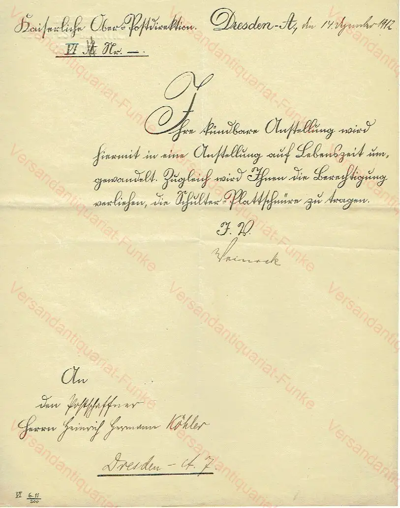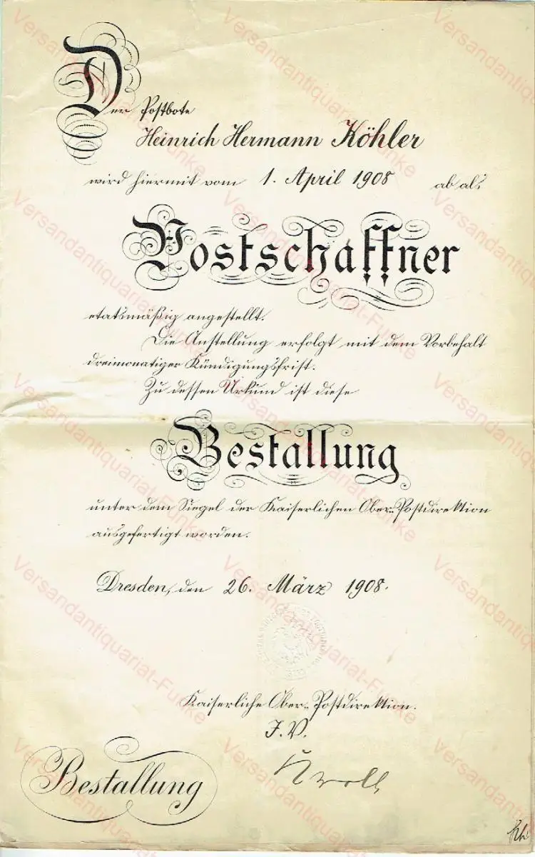 guter Zustand, Gebrauchs- und Alterungsspuren: quer gefalten - 2 auch senkrecht geknickt - vergilbt - mit kleinen Randblessuren - teils etwas knittrig - von der Bürgerrechtsurkunde wurde leider das Siegel entfernt, Postschaffner war der unterste Dienstgrad bei der Post (sogenannter "Einfacher Dienst"). Die Tätigkeit konnte fast alles sein, was mit der Post zu tun hatte, z. B. Briefträger, bis hin zur Verwaltungstätigkeit. Sie erhalten folgende original Urkunden: - Bestallung (= Einstellung/Arbeitsvertrag) vom März 1908 (mit den Dienstbedingungen und dem Gehalt) - Verleihung des Bürgerrechts der Stadt Dresden vom April 1910 - Urkunde der Kaiserl. Ober-Postdirektion Dresden, in der der Postschaffner auf Lebenszeit angestellt wird und ihm die Berechtigung erteilt wird, die Schulterschnüre zu tragen (Dezember 1912), Papier, ca. 20,5 x 26 bis 21 x 33, 5 beschriebene Seiten auf 7 Blatt, auf Firmenpapier, teils mit Wasserzeichen und Blindstempel