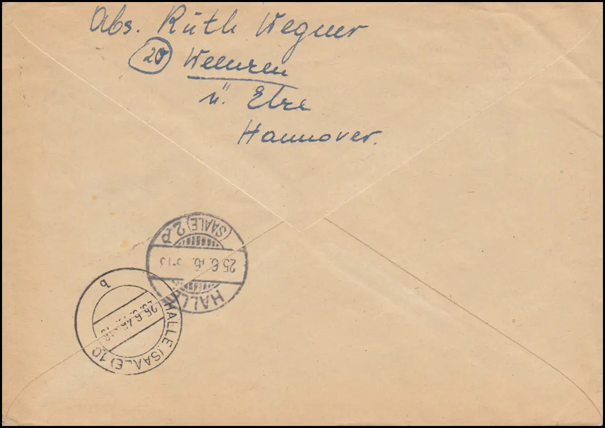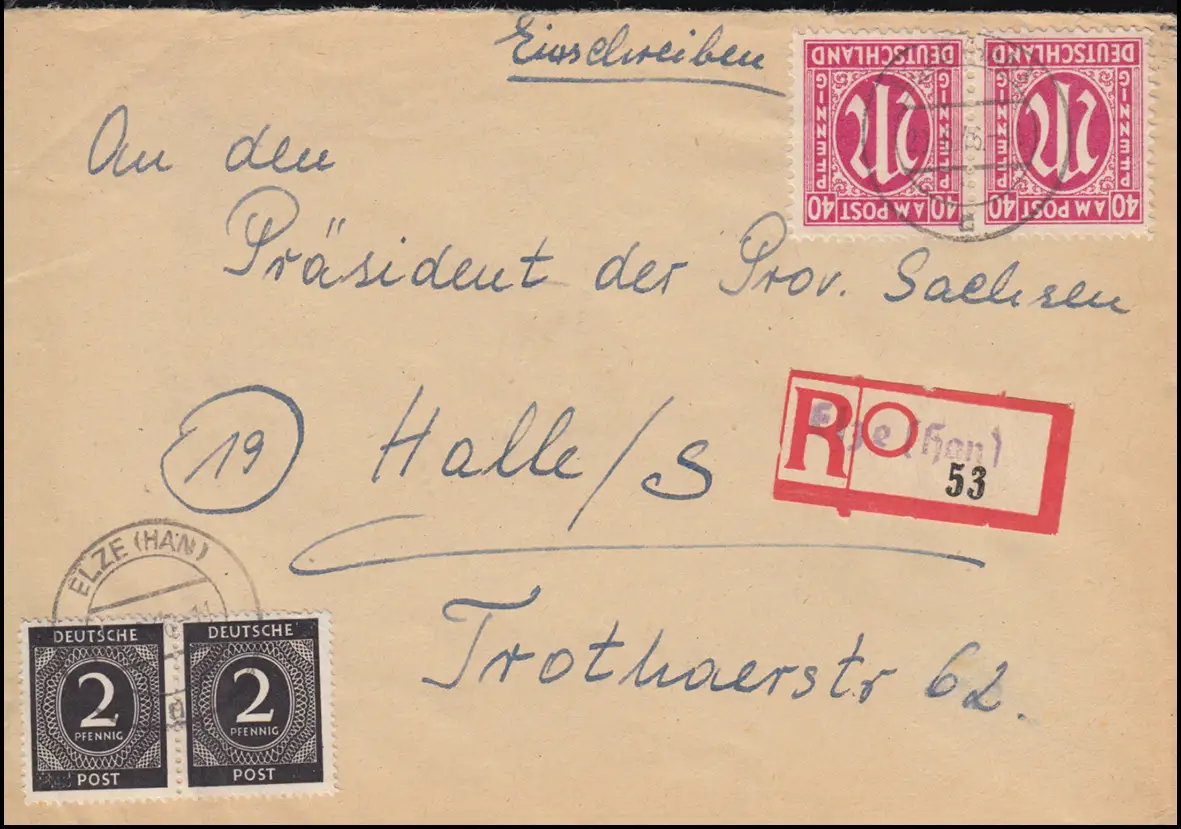 portogerechte Mischfrankatur von Kontrollrat mit AM-Post auf Einschreiben im Fernverkehr, Ankunftsstempel HALLE / SAALE 2 p 25.6.46