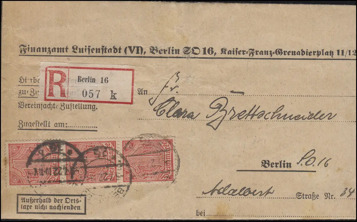 30 Dienstmarke 1 Mark portogerechte MeF R-Brief Finanzamt BERLIN 16 - 5.7.1922