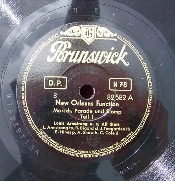 (3001008) Louis Armstrong. New Orleans Function. Alte Schellack-Schallplatte. Siehe bitte Beschreibung u. Bilder Louis Armstrong "New Orleans Function I" "New Orleans Function II". Marsch, Parade u. Stomp - Louis Armstrong und seine All Stars. Brunswick 82582 A + B. Alte Schellack-Schallplatte. N 78. Durchmesser ca. 25 cm. Alle angebotenen Schellack-Schallplatten sind mehr oder weniger gebraucht. Zum Teil auch mit starken Gebrauchsspuren. Auch können sie etwas verschmutzt sein. Die Platten sind nicht probeabgespielt. Die Schellack-Platten sind Originale der damaligen Zeit und sind auch sehr beliebt nur als Nostalgieobjekt. Somit ist dieses Angebot vermutlich für jene Sammler nicht geeignet, die besonderen Wert legen auf exzellenten Zustand sowie auf einwandfreie Musikwiedergabe