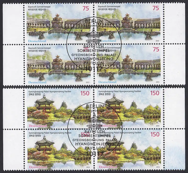 Sonnentempel Bayreuth und Pavillion Seoul - zwei Viererblöcke komplett, zentrischer Ersttags-Sonderstempel Berlin 6.6.2013