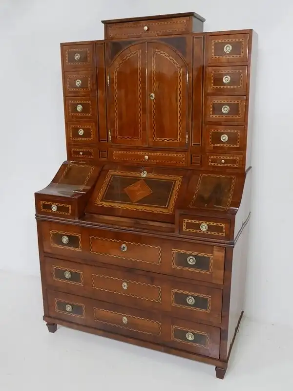 ein prachtvoller, josefinischer Tabernakel in wunderschönen Gesamtzustand, der Tabernakel wurde komplett überarbeitet und mehrfach Schellack handpoliert, 3 durchgehende Schubladen im unteren Bereich, 13 Schubladen, 2 Flügeltüren, sowie eine ausklappbare Schreibfläche im oberen Bereich, herrliches Furnierbild mit Intarsien (Einlegearbeiten) einwandfreier Gesamtzustand. Die Bilder sind Teil der Beschreibung und sprechen für sich, hinstellen und daran erfreuen. \n\nMaße: ca. 124 cm breit ca. 208 cm hoch ca. 58 cm tief \n\nArtikelnummer: 3024