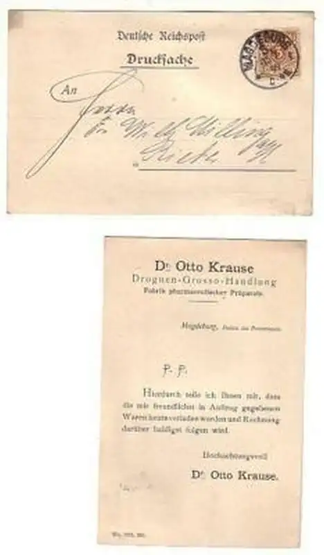 Reklame / Werbekarte, Dr.Otto Krause Droguen Grosso Handlung Fabrik pharmaceutischer Präparate Magdeburg, gelaufen, gute Erhaltung siehe Bild,