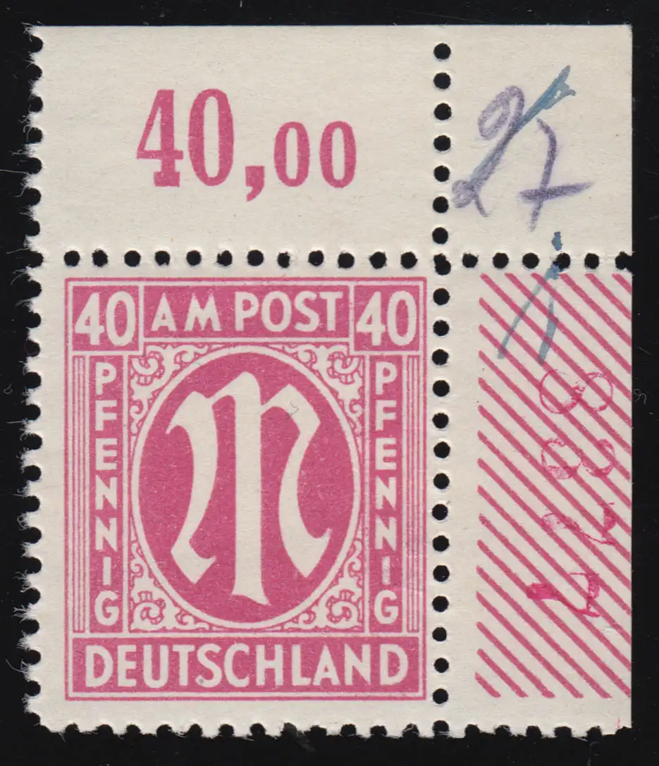 30aA zr4 AM-Post 40 Pf Ecke, rote Bogenzählnummer, ungefaltet, ** gp. Wehner BPP