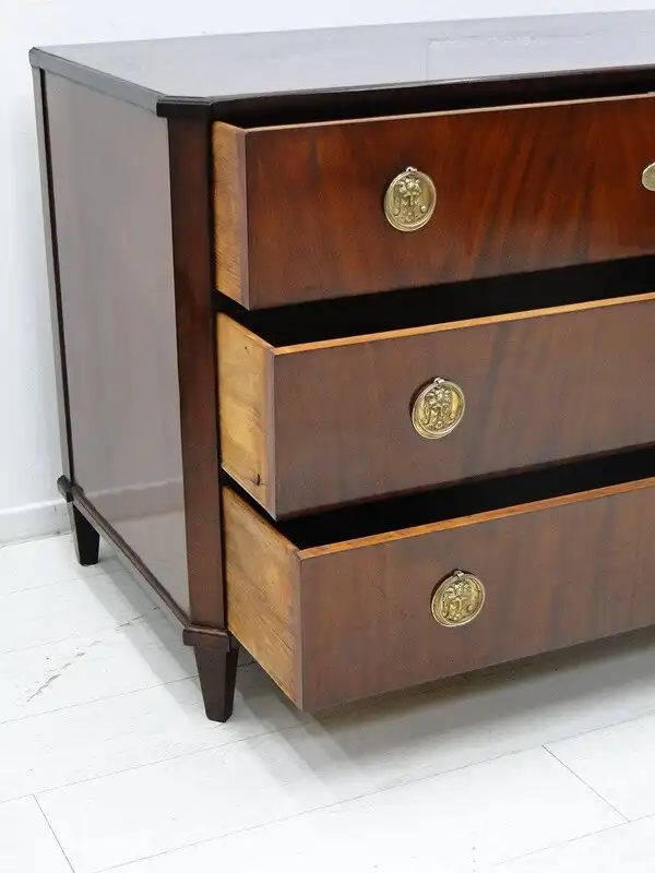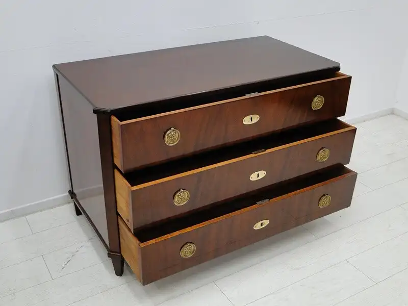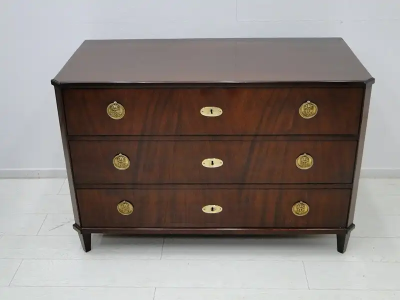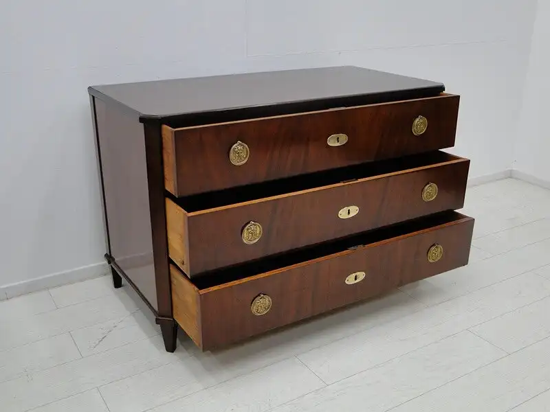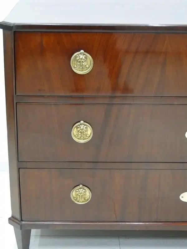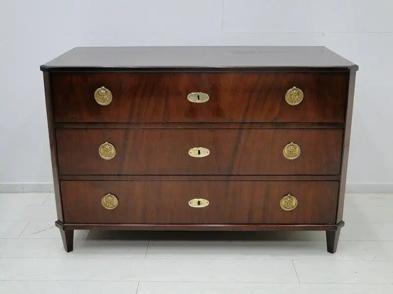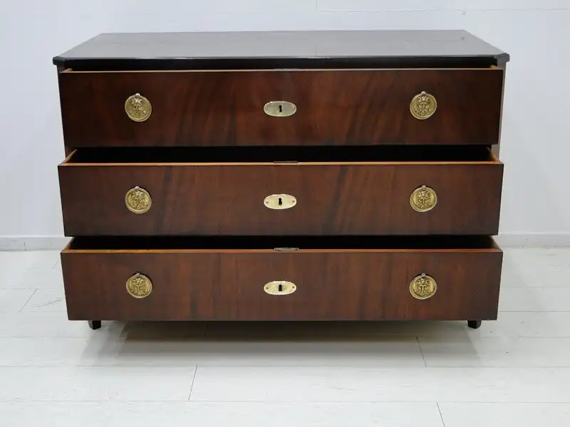 Eine fantastische, josefinische Kommode, mit 3 Schubladen, traumhafte Beschläge herrliches mahagoni Furnierbild mit einem sehr schlichten Design, ORIGINAL Schlösser, kein Schlüssel vorhanden, die Kommode wurde überarbeitet und mehrfach handpoliert, hinstellen und daran erfreuen. \n\nMaße: ca. 128 cm breit ca. 85 cm hoch ca. 63 cm tief \n\nArtikelnummer: 3127 Artikelstandort: KS-H