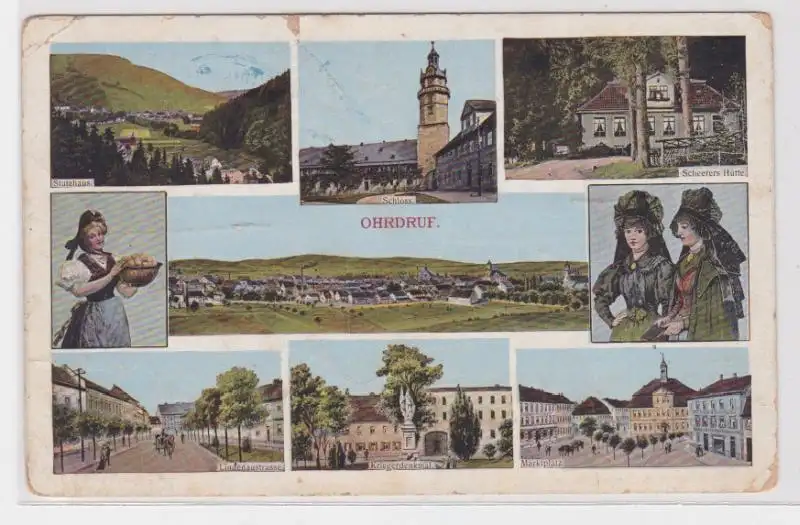 Totalansicht, Stutzhaus, Schloss, Scheerers Hütte, Thüringer Trachten, Lindenaustrasse, Kriegerdenkmal, Marktplatz, gelaufen mit Feldpoststempel, gebrauchte Erhaltung (leichte Altersspuren) siehe Bild,