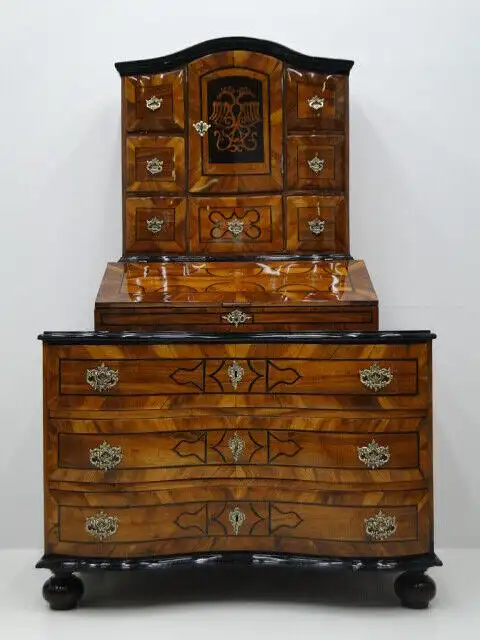 ein fantastischer Tabernakel, ORIGINAL Barock um 1740, mit herrlichem Furnierbild sowie wunderschönen Intarsien (Einlegearbeiten) 3 durchgehende Laden im unteren Bereich, eine Flügeltüre und 7 kleine Laden im oberen Bereich mehrfach Schellack handpoliert, TOP Zustand, ein Prachtstück. \n\nMaße: ca. 122 cm breit ca. 187 cm hoch ca. 62 cm tief \n\nArtikelnummer: 3273