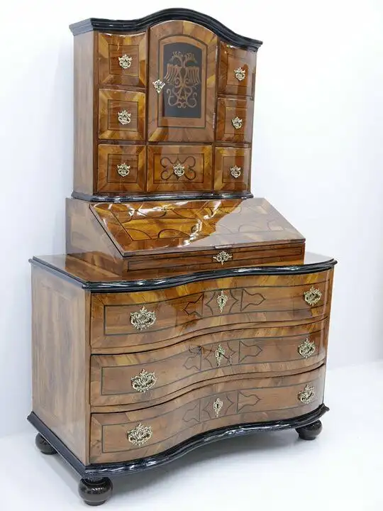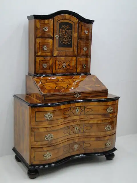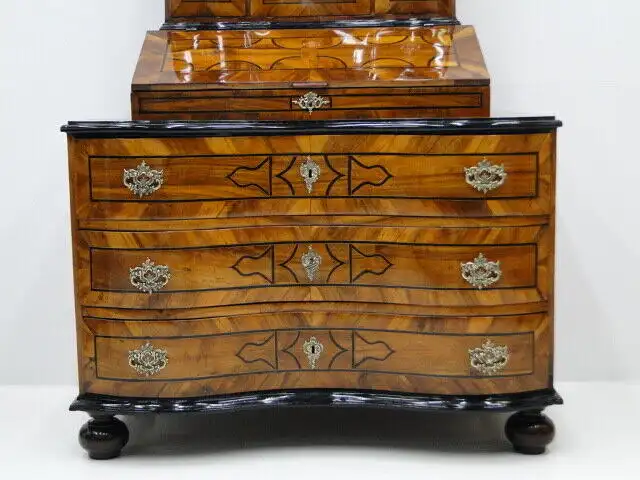 ein fantastischer Tabernakel, ORIGINAL Barock um 1740, mit herrlichem Furnierbild sowie wunderschönen Intarsien (Einlegearbeiten) 3 durchgehende Laden im unteren Bereich, eine Flügeltüre und 7 kleine Laden im oberen Bereich mehrfach Schellack handpoliert, TOP Zustand, ein Prachtstück. \n\nMaße: ca. 122 cm breit ca. 187 cm hoch ca. 62 cm tief \n\nArtikelnummer: 3273