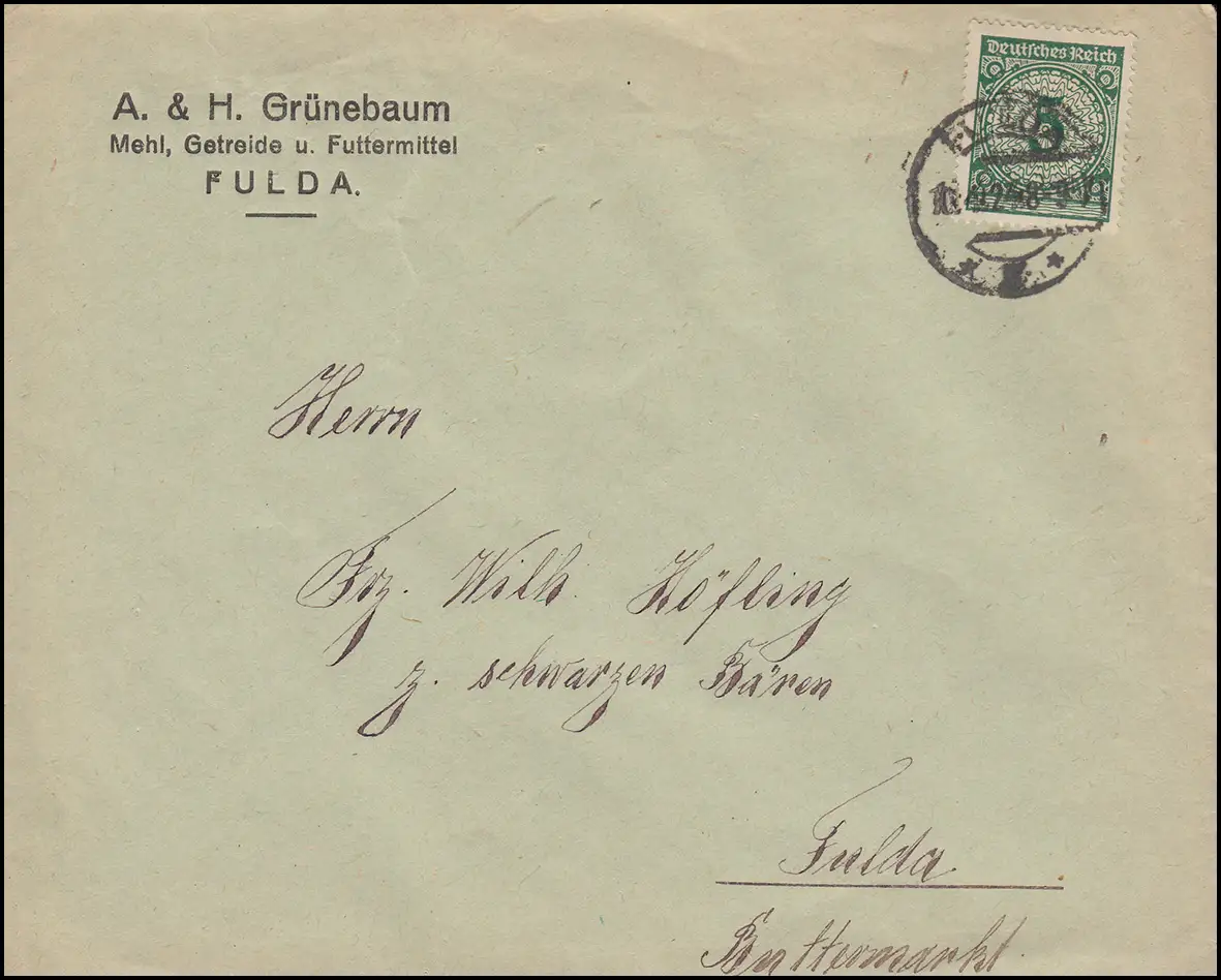 339Wa Korbdeckel 5 Pf als EF Orts-Brief Mehl Getreide Futtermittel FULDA 10.4.24