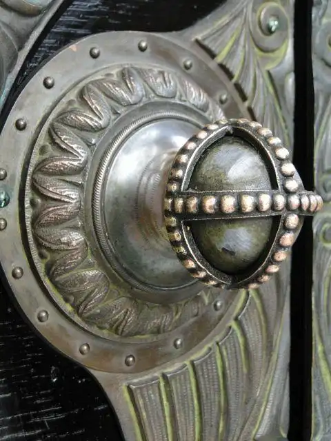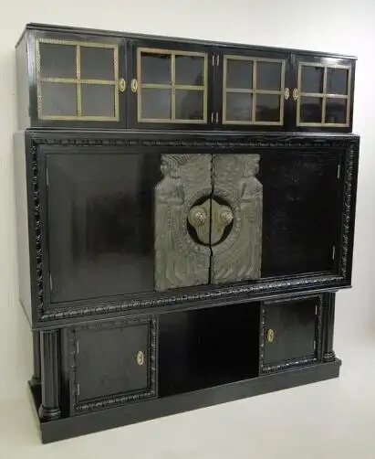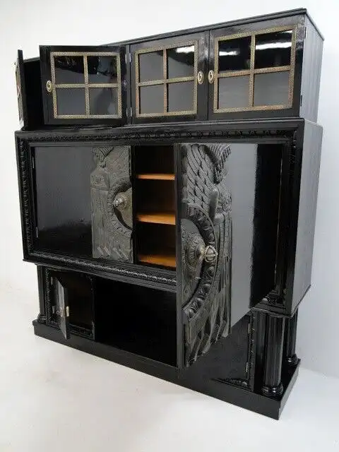 ein absolutes TOP Stück, schwarzer Korpus mehrmals Schellack überarbeitet - wenn man näher heran geht erkennt man die herrliche Holzmaserung unter dem Schellack, wunderschöne Schnitzereien im Mittelteil, ORIGINAL Beschläge, ORIGINAL Schlösser, mit traumhaften wuchtigen Messinggriffen. \n\nMaße: ca. 188 cm breit ca. 193 cm hoch ca. 51 cm tief \n\nArtikelnummer: 3413