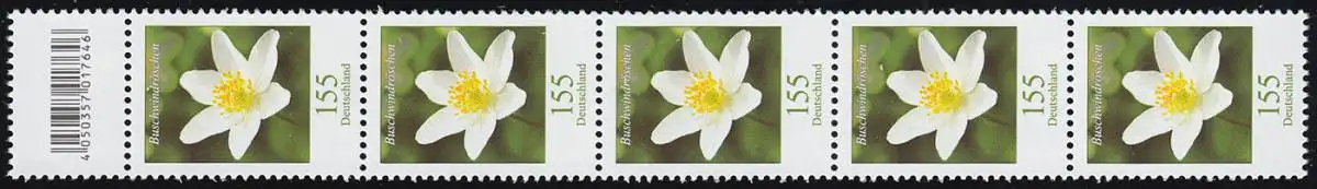 3472 Buschwindröschen 155 Cent 500er kleine Nr., 5er-Streifen mit Codierfeld **